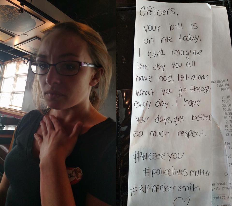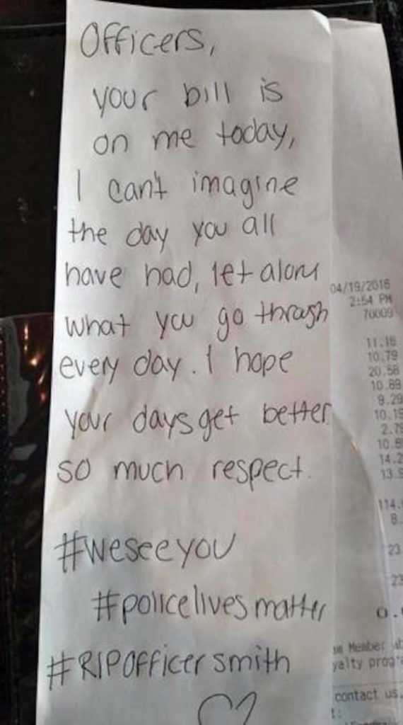 „Offiziere, Ihre Rechnung ist heute auf mich. Ich kann den Tag nicht vorstellen, dass Sie alle haben, geschweige denn, was Sie durch jeden Tag gehen. Ich hoffe, Ihre Tage besser. So viel Respekt. #WeSeeYou #PoliceLivesMatter #RIPOfficerSmith.“