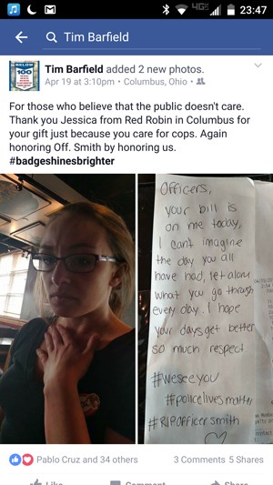 Es gab neun Polizei zusammen, die im roten Robin-Restaurant sitzen. Jessica erkundigte sich nach der Situation, von der sie sich fühlte, und einer der Polizei sagte: "Sie wissen, es ist immer ein rauer Tag, an dem Sie einen Bruder auf den Boden legen müssen", sagte JessicaWcmh Columbus. "Gleich danach war ich wie "Ich muss etwas richtig machen", fügte sie hinzu.