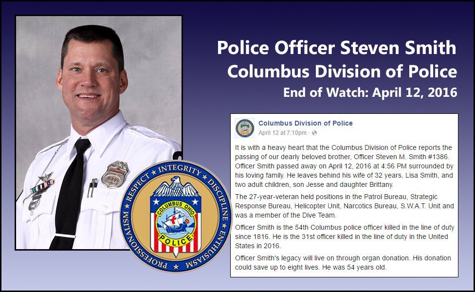 Officer Steve Smith starb auf der Linie der Pflicht. Er arbeitete 27 Jahre lang in der Columbus Divison der Polizei. Er hinterließ seine liebende Frau und zwei Kinder Bretagne und Jesse. Obwohl die Familie in zerspringt nach der Nachricht gelassen wurde, waren sie von Steve stolz. Er lebte als Held und starb wie ein.