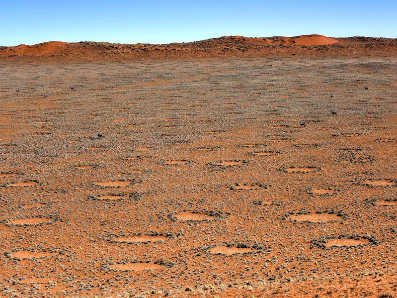 Die Namib-Wüste im südlichen Afrika hat Patches auf dem Boden mit dem Namen "Fairy Circles". Niemand weiß, woher kam es. Ihr Ursprung ist immer noch ein Rätsel. Waren sie von Termiten, wettbewerbsfähigen Anlagen oder an den Füßen Gottes gemacht?