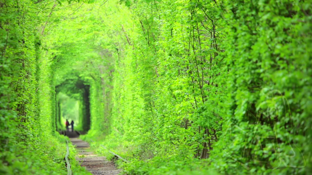 Das sieht nichts weniger als ein Märchen aus. In der Ukraine gibt es einen industriellen Bereich der Eisenbahnhalle, der diesen grünen blättrigen Tunnel verläuft. Es ist zufällig ein Spot eines Paares, da hier romantische Paare spazieren gehen.