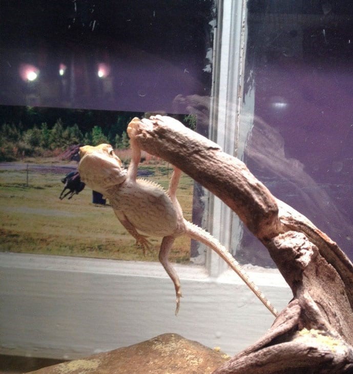 Vielleicht haben Sie zweimal am Tag ins Fitnessstudio gehen, und Sie werden immer noch nicht leicht in der Lage sein, eine einzige Hand und ein Bein hängen mit. Aber diese Eidechse macht es so leicht. Der Gesichtsausdruck dieses Talent zeigt, dass dies keine große Sache für den Kerl, und es scheint, wie es sagt: „Gib mir etwas schwer zu versuchen.“