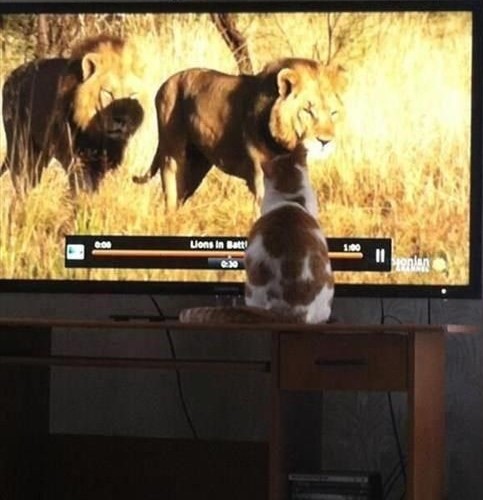 Haustiere, die das Fernsehen ansehen, ist eines der größten Dinge, und sie werden so daran interessiert, dass etwas mit Tieren in den Fernseher auftaucht. Diese Katze ist so beschäftigt, seinen großen Bruder, Löwen auf dem Fernseher zu sehen. Beide gehören zu derselben Familie und die Katze scheint auch an seinem großen Bruder zu interessiert.