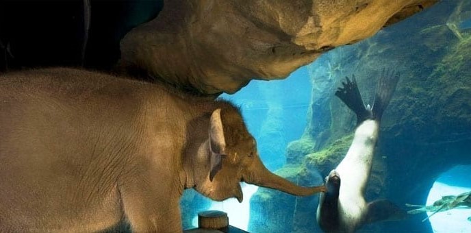 Dieses Bild stammt aus dem Oregon Zoo, wo die Tierhandler diesen schönen Damen-Elefanten an einem Morgenweg aufgenommen haben, um andere Tiere zu treffen. Die Art und Weise, in der die nächsten Ereignisse entfaltet, war eine Szene, die in der Wildnis nicht möglich ist, aufgrund der verschiedenen Lebensräume, aus denen die beiden betroffenen Parteien kommen. Sie stieß auf einen Seelöwen und sie hat ihr Unternehmen wirklich genossen.
