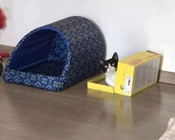 Eine andere Sache, für die Katzen bekannt sind, ist dafür, dass es annamant ist. Sie könnten sie das schönste der Sachen kaufen und sie wollen immer noch ihre alten Sachen. Dieses Bild ist auch ungefähr gleich. Die Person hat ihm ein neues und schönes Zuhause gekauft, aber sie ist nicht bereit, sich zu verschieben, und gibt ihnen den Look, als würde sie sagen, dass sie sagen will "Versuchen Sie nicht, mich zu beschuldigen, um unnötige Dinge zu kaufen."