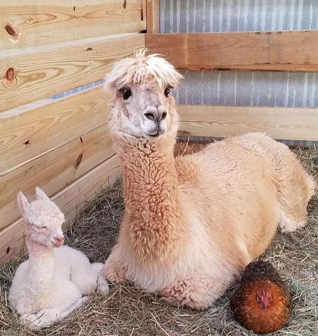 Diese Alpaka brachte ein Baby Alpaca zur Welt, und dieses Huhn sieht aus, als hätte es einfach ein Geschwister, und das Baby Alpaka ist völlig verwirrt, während er in Richtung Hühnchen schaut. Dieses Bild stammt von einer Kinderschule, und sie haben sich über das Hühnchen lustig gemacht, das das Hähnchen der Hähnchen ist, der Hähnchen ist die Godmutter des Alpaka-Babys.