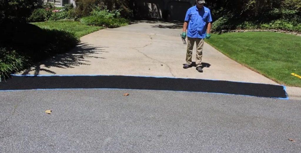 Der Mensch versucht, eine Beule auf seiner Einfahrt zu reparieren, die das Mysterium darunter nicht bewusst ist