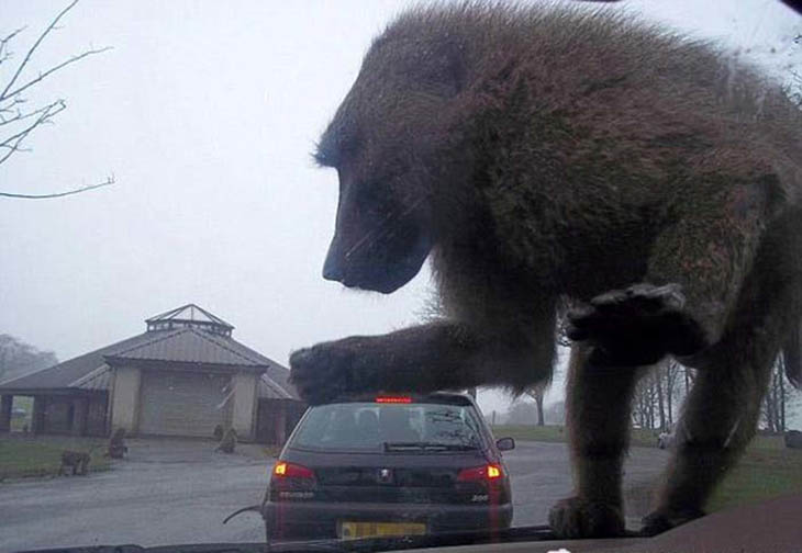 Dies ist nur ein gut zeitgemäßeres Foto, wenn ein Affe versehentlich auf die Windschutzscheibe eines Autos sprang, während der Fahrer drinnen saß und dieses Meisterwerk eroberte.