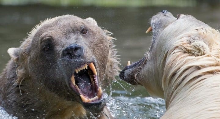Grizzlybären haben begonnen, sich in die polaren Gebiete zu bewegen. Erwärmende Sommer haben mehr Land das Eis, und Polar verbringt den größten Teil ihrer Zeit auf Land, da es kein Eis gibt. Grizzlies bewegen sich nach Norden auf der Suche nach Land und landen in den Territorien der Eisbären.