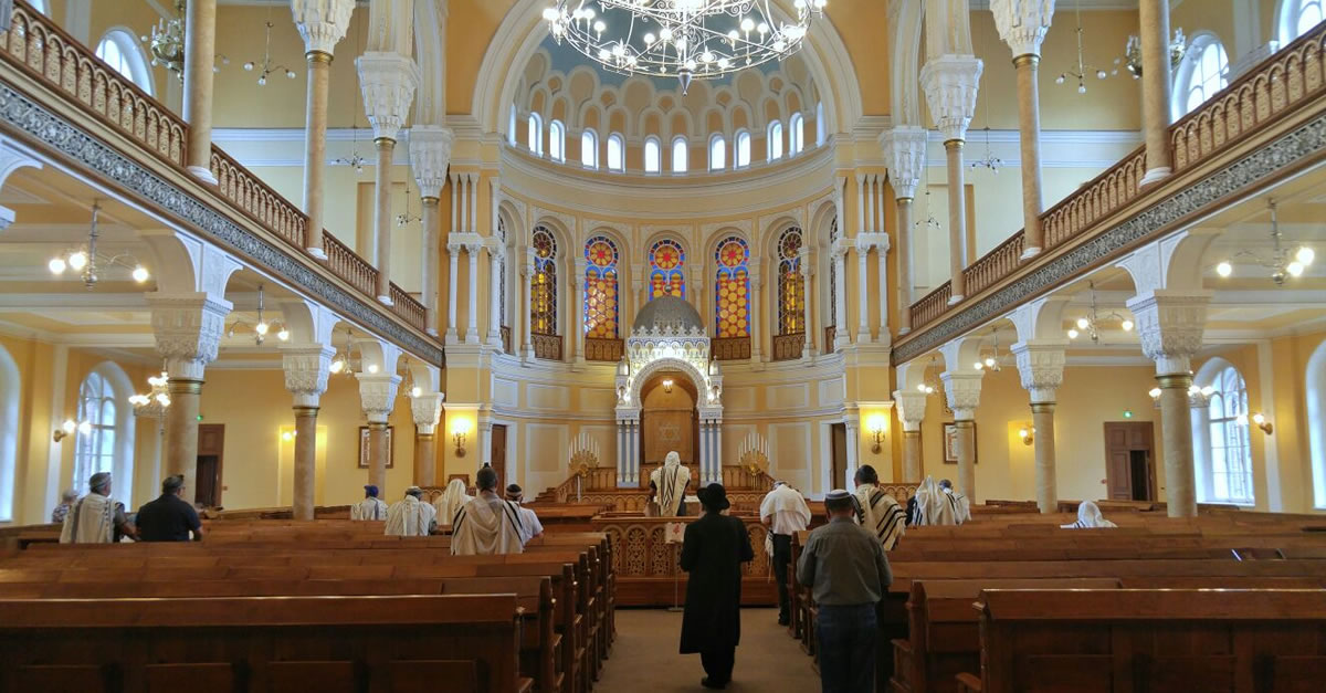 Und bald begann das Video das Innere der Synagoge zu erfassen. Die Synagoge ist mit Hochzeitsgästen dauerhaft. Abraham Salomon Levison ist der Chief Rabbi der Region. Der Mann tinkt einen schwarzen hexagonalen Hut.