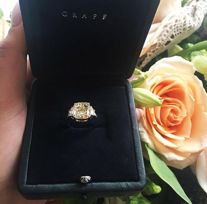 Nun, niemand wurde von dem Vorschlag bestätigt, aber sie war mit einem Graff-Diamantring begab, dessen Wert mehr als 20 Millionen beträgt. Ein solcher Ring muss ein Vermögen kosten! Das Bild des teuren Rings wurde in sozialen Medien veröffentlicht, aber aus irgendeinem Grund wurde es gelöscht. Aber später gab Timati selbst zu, dass er dem Ring an seine Freundin begabt hatte.