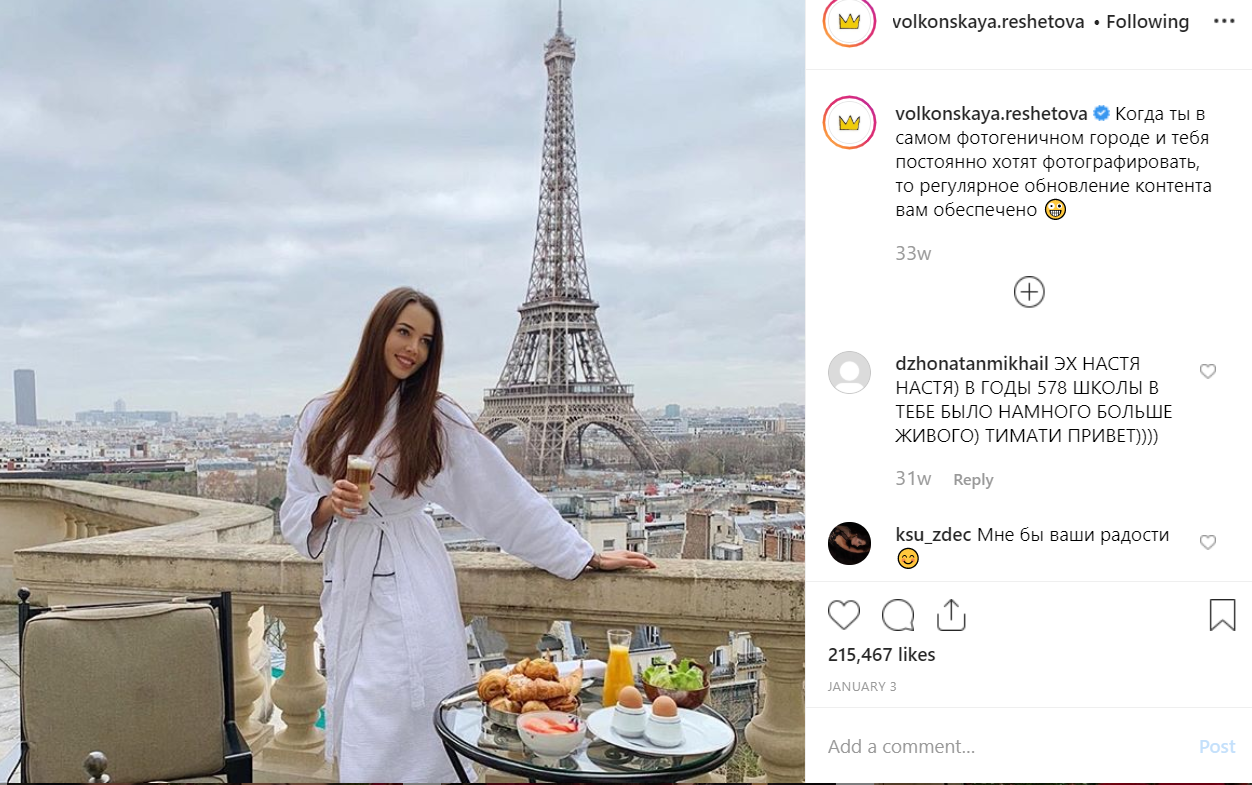 Später enthüllte sie: „Mein Vater ist hart. Er folgt mein Leben in sozialen Netzwerken und ist sehr unzufrieden mit ihm: zuerst ein tiefes Dekollete, dann ein Foto mit einer Zigarre und einer Flasche. Im Allgemeinen rauche ich nur Shisha und nicht trinken, aber habe jemanden kümmert sich um das? Zwar hat die Zeit, um eine Art, die Dinge in Ordnung Einstellung, und er versucht, mit der Idee zu setzen, dass dies nur ein Bild ist.“ Sie hat auch gesagt, dass ihr Vater sie auf Social Media folgt.