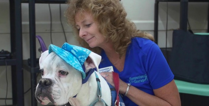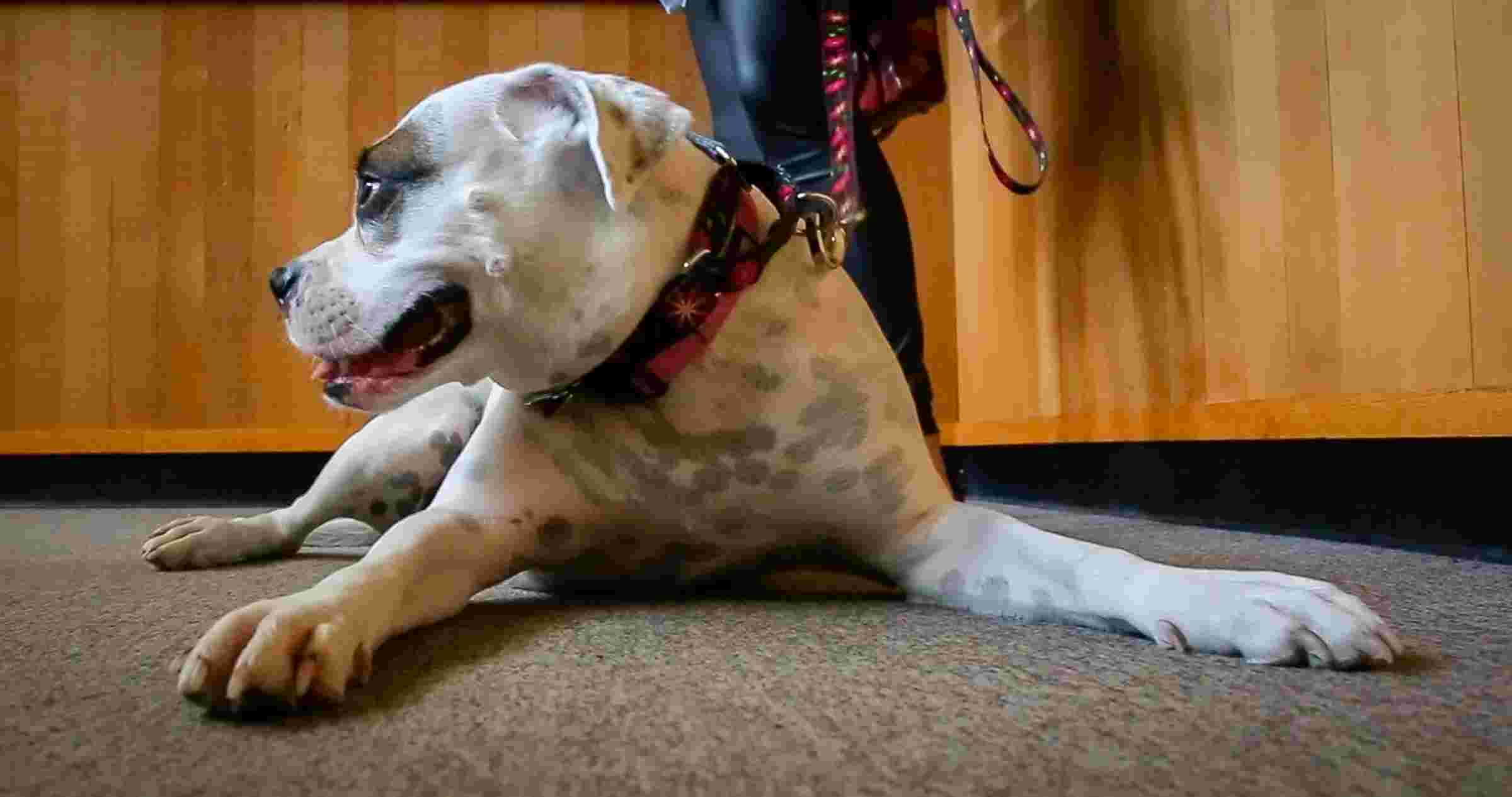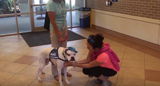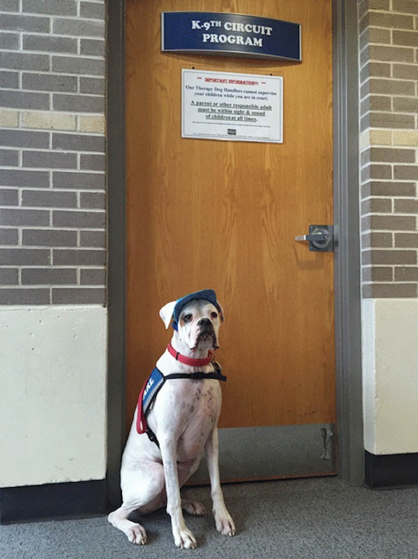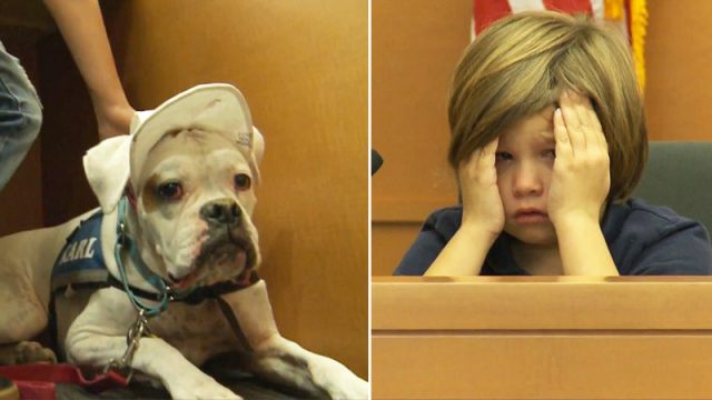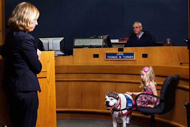 Der taube Hund läuft in Richtung des 7-jährigen Mädchens im Zeugenkasten in einem Gerichtssaal aus einem unglaublichen Grund