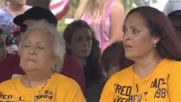 "Patsy", sagte Lanie: "Unsere Familie fühlt sich so geehrt an, dass sie ausgewählt wurde, um diese Flagge zu finden ... danke, dass Sie dieses Stück Ihres Jungen mit uns geteilt haben." Und mit diesen Worten und Tränen in den Augen reichte sie die Flagge an Fred Maciels Mutter.