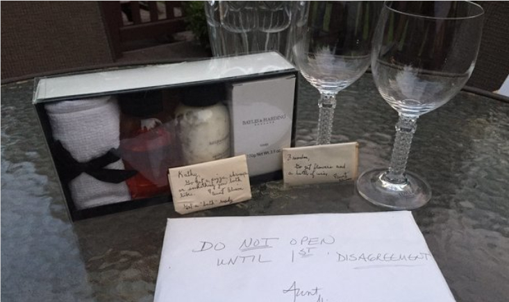 Es ist schwer zu sagen, warum gute Zeit so schnell fliegen. Zwei Jahre ihrer Ehe gingen vorbei, und das Geschenk blieb noch nicht ungeöffnet. Das Duo feierte ihr Jubiläum mit ihrer Familie und es ist dann Tante Allison gebeten, wenn sie das Geschenk noch geöffnet hatte, und die Frau antwortete nein. Was als nächstes passiert ist "Sie sah uns auf uns an, als wären wir verrückt."