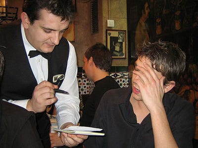 Was die anderen Kellner nicht wussten, war, wie das Gespräch zwischen den beiden ging. Als der Kellner dem Mann mit dem Menü näherte, weigerte sich der Mann, sich sogar anzusehen. Aber dieser Kellner war ein bisschen hartnäckig, also versuchte er, den Mann zu bezaubern. Aber der Mann hatte eine Überraschung für den Kellner.
