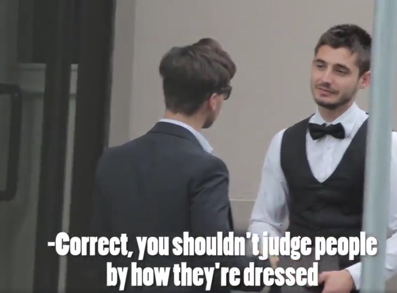 Dieses soziale Experiment zielt darauf ab, zu beweisen, dass die Menschen viel zu materialistisch sind. Sie richten sich gegenseitig und behandeln Menschen nach ihren Auftritten. Die Kellner weigerten sich, einen obdachlosen Mann zuzulassen, der freundlich und höflich mit ihnen sprach, im Restaurant, auch wenn er sagte, er kann für sein Essen bezahlen.