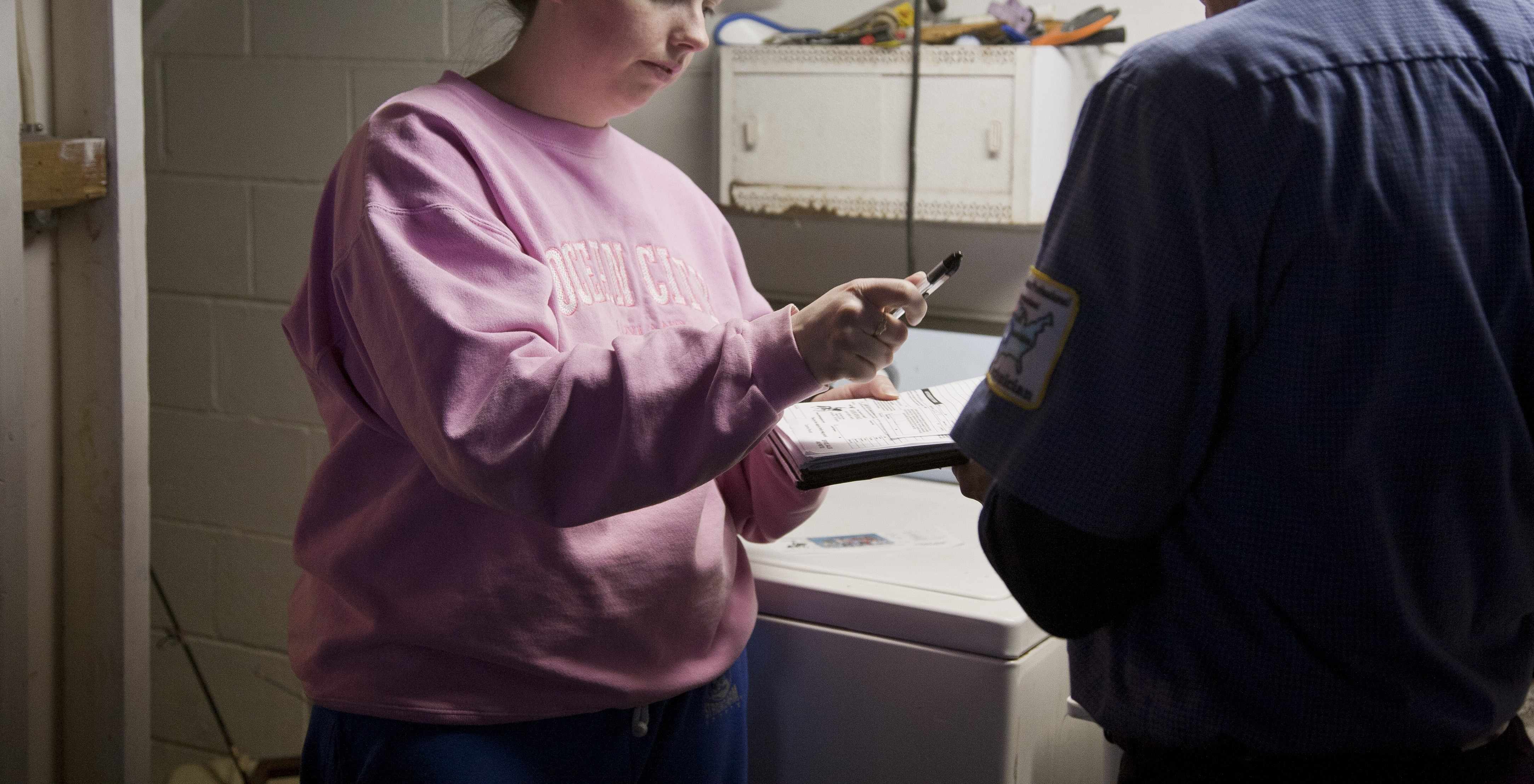 Der Reparaturmann sagte dem falschen Besitzer, dass er einen Blick auf den Belüftungsschacht ansehen würde. Die Dame zeigte ihm den Weg zur Treppe. Der Mann sagte, er hätte einen Blick darauf werfen und dann kommen und ihr davon erzählen, wie viel die Servicekosten anbieten würden.