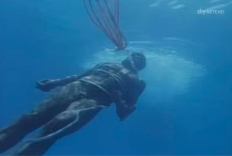 Stefano zunächst dachte, es war ein menschlicher Arm, aber als er ging näher an sie, etwas anderes herausstellte. Die Hand war ein Teil einer großen Statue, die auf dem Meeresboden lagen. Die Statue war unerforscht und sah ein wenig altertümlich so Stefano dachte an externe Hilfe nehmen.