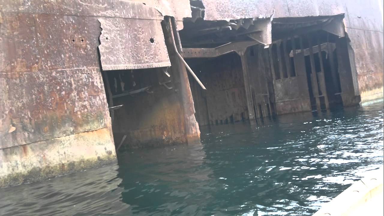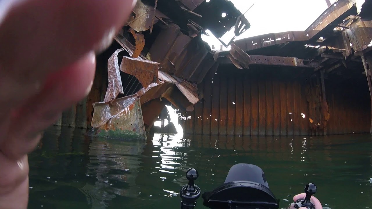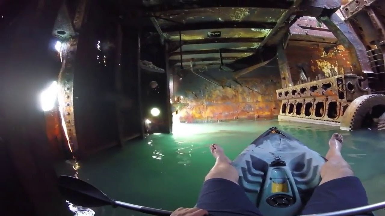 Eine Seite des Rumpfes des Schiffes hat einen kleinen Riss, der als Eingang betrachtet werden kann. Aber der Riss ist zu klein für ein Boot, um darin einzugehen. George beschloss also, stattdessen ein Kajak zu nehmen. Egal wie schwierig die Bedingungen, George, die es in das Schiff schaffen würde, und herausfinden, was alles, was es tatsächlich umfasst.