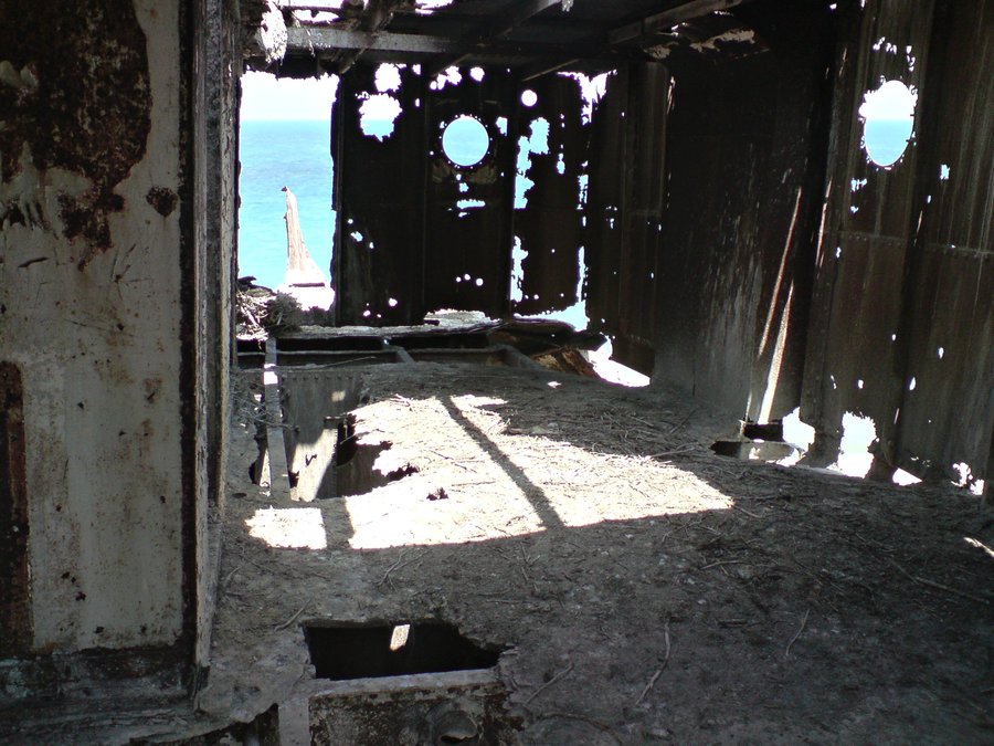 Das Interieur des Schiffes war dunkel und mit Rost bedeckt, aber das kleine Licht, das durch die Risse gegossen hat, machte jede Ecke ausreichend sichtbar. Es gab kaum einen Unterschied im Zustand des Schiffes im Vergleich zu der Außenseite davon. Es war fast gleich. Rusty, alt, gebrochen, gebrochen und instabil.