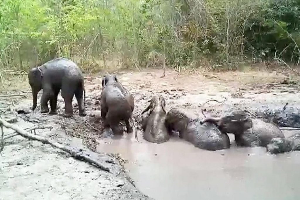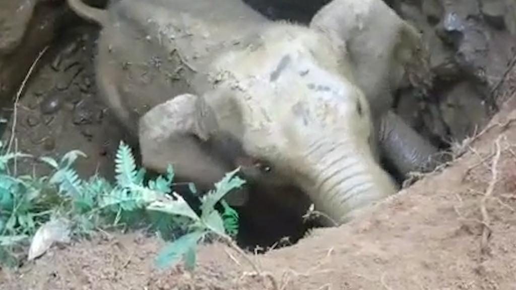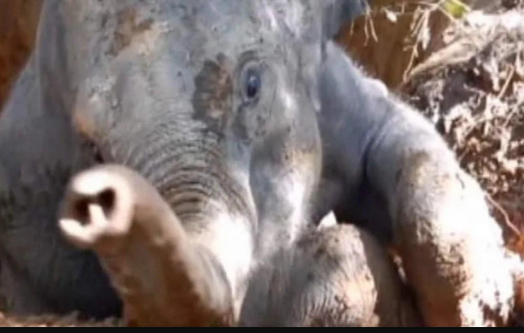 Baby Elefant steckte in einem schlammigen Loch, wird Hilfe von einer unerwarteten Quelle