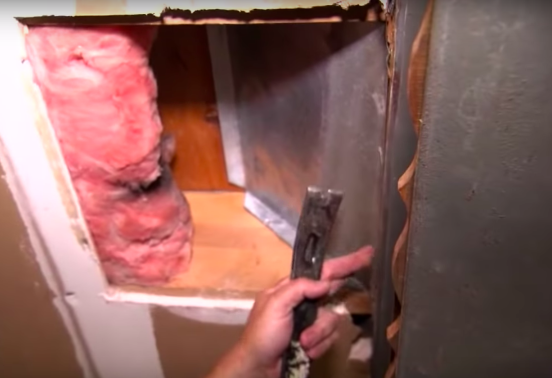 Die Auftragnehmer begannen ihre Inspektion der Entlüftung. Der Sound ist das lauteste in ihrem Wohnzimmer, so viel sie erzählen könnten. Das Duo entfernte also die Öffnung in die Luftentlüftung im Wohnzimmer und schaffte darauf, nach innen zu schauen. Aus dem Aussehen davon gab es nichts Ungewöhnliches über die Entlüftung. Aber das heißt, wenn sie eine weitere Öffnung der Entlüftung bemerkten, die mit der Garage verbunden war.