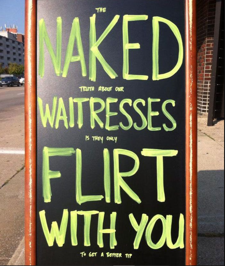 Dieses Zeichen ist ein weiteres Meisterwerk der Werbung mit den verschiedenen Buchstabengrößen, um die Nachricht in der Neonfarbe hervorzuheben. Das Restaurant muss sicherlich attraktive Kellnerinnen haben, aber das Zeichen warnt die Männer eindeutig, dass sie von großen Tipps verwöhnt werden können, aber sie werden ihre Kleider nicht dafür nehmen. Wer dieses Zeichen hat, weiß, dass diese Kellnerinnen nicht nur attraktiv sind, sondern auch clever!