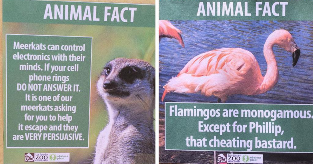 Vorbei sind diese Tage, an denen Eltern ihre Kinder zum Zoo brachten, wo sie sich über die Tiere erfahren konnten. Jetzt wird er ersetzt, dass die Erfahrung durch hochwertige Fernseher ersetzt wird, da die Menschen leicht zu erleben, während sie sich in ihren Häusern befinden. Also ging dieser Zoo in Los Angeles aus dem Weg, um mehr Besucher zu erhalten, und zeigte einen Vorstand, den der Zoo den Besuchern nicht nur den Vornamen des Flamingo erzählt, sondern sie können auch über ihre persönlichen Gewohnheiten erfahren, die sowohl störend als auch glaubwürdig sind . Das nächste Mal, wenn Sie diesen Zoo und Ihre Telefonringe besuchen, können Sie wahrscheinlich erraten, dass es einer der Mehre des Zoos um Hilfe um Hilfe bittet. Ziemlich komisch, recht!