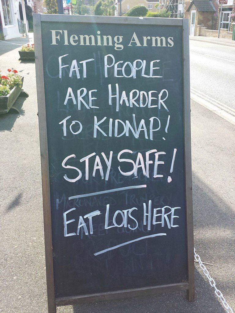 Dieses Zeichen nimmt Werbung auf eine andere Ebene. Es scheint, dass die meisten Menschen, die in dieses Restaurant kommen, Geizflächen sind und nur leichte Snacks und Getränke essen. Die Besitzer der flemingenden Arme, ein Familienrestaurant im Binstead-Dorf, wählen einen effektiven Weg, um ihren Umsatz zu wandern, indem Sie ein Schild aufstellen, das sagt, dass "fette Leute schwieriger sind, sich härter zu entführen". Sicherlich wird es Menschen dazu bringen, Mahlzeiten zu kaufen, wenn nicht wegen des Hungers, sondern um sich vor zu schützenentführert. Wenn dieses Schema als wahr ist, wäre es eine große Erleichterung der örtlichen Polizei.