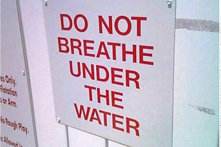 Dieses Zeichen ist ziemlich rhetorisch, da offensichtlich, der unter Wasser atmet, es sei denn, die Person ist eine Meerjungfrau. Und es scheint, als ob der Eigentümer glatet, dass sein Pool vielleicht ein berühmter Award-Punkt von Meerjungfrauen sein könnte, und sie müssen oft herumhängen. Daher beschränkte sie sie von der Atmung unter Wasser. Aber hier sind wir gefragt, welchen Schaden verletzt werden könnte, wenn sie atmenunter dem Wasser, es sei denn, sie pinkeln, wenn sie nicht aus ihrem Mund oder Nase pissen!