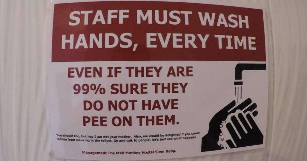 Obwohl wir unterrichtet worden sind, um unsere Hände jedes Mal zu waschen, scheint es in einem Hostel in Kambodscha zu sein, in dem sie ein Schild aufgestellt hatten, um das Personal daran zu erinnern, dass sie ihre Hände waschen. Dieses Zeichen kann ziemlich nervig sein, aber die Gewissheit, dass es den Herbergen gibt, ist ziemlich zufriedenstellend. Denn wer will Essen aus schmutzigen Händen essen!