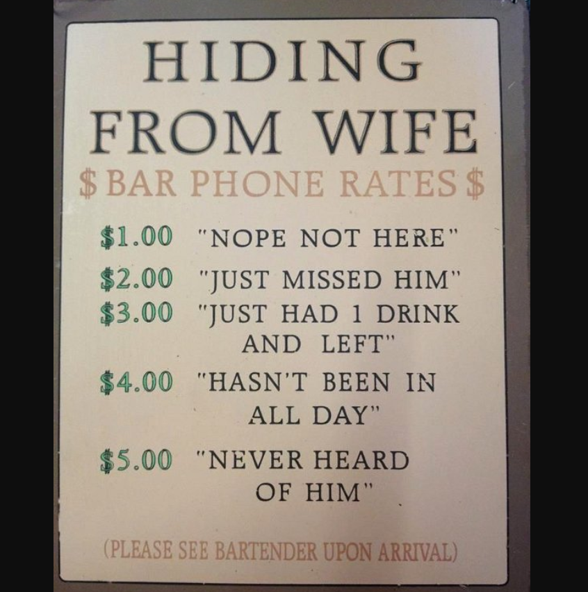 Heute, wenn jeder der Suche nach neuen Wegen denkt, Geld zu verdienen, so Bars und Pubs zu werden neue Wege versuchen, ihre Hände auf mehr Geld zu bekommen. Wir alle wissen, dass die meisten Menschen, die an den Bars kommen könnte, zu ihren Frauen gelogen haben und Freundinnen genießenihrLeben ein bisschen. Aber Frauen sind nicht weniger als alle Detektive, können sie eine Lüge von einer Meile schnuppern. Dieses Zeichen auf einer Stange aufgehängt versichert, dass sie nicht hier gefangen. Es wird interessant sein zu wissen, ob dieser Überfall Männer ihr Leben ein wenig genießen kann helfen!