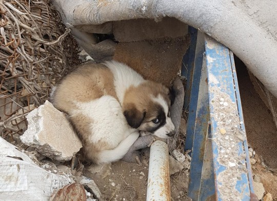 Sean hob den Block von Zement und warf es beiseite. Sobald sich der Staub gelegt hatte, landete Seans Augen auf, was sich unter dem riesigen Zementblock war. Es war ein Wurf von fünf Welpen, von denen vier verstorben war. Aber einer von ihnen wurde von seinen Geschwistern umgeben in einem kleinen Ball zusammengerollt. Seans Herz beim Anblick geschmolzen.
