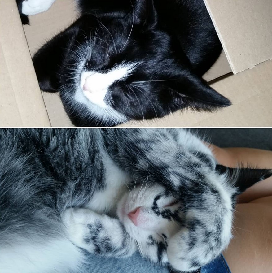 Der Unterschied ist hier klar. Die Katze, als fünf Monate alterer und weniger weiß war, aber jetzt hatte sie sich vollständig verändert. Obwohl sie jetzt anders war, war sie noch schöner geworden.