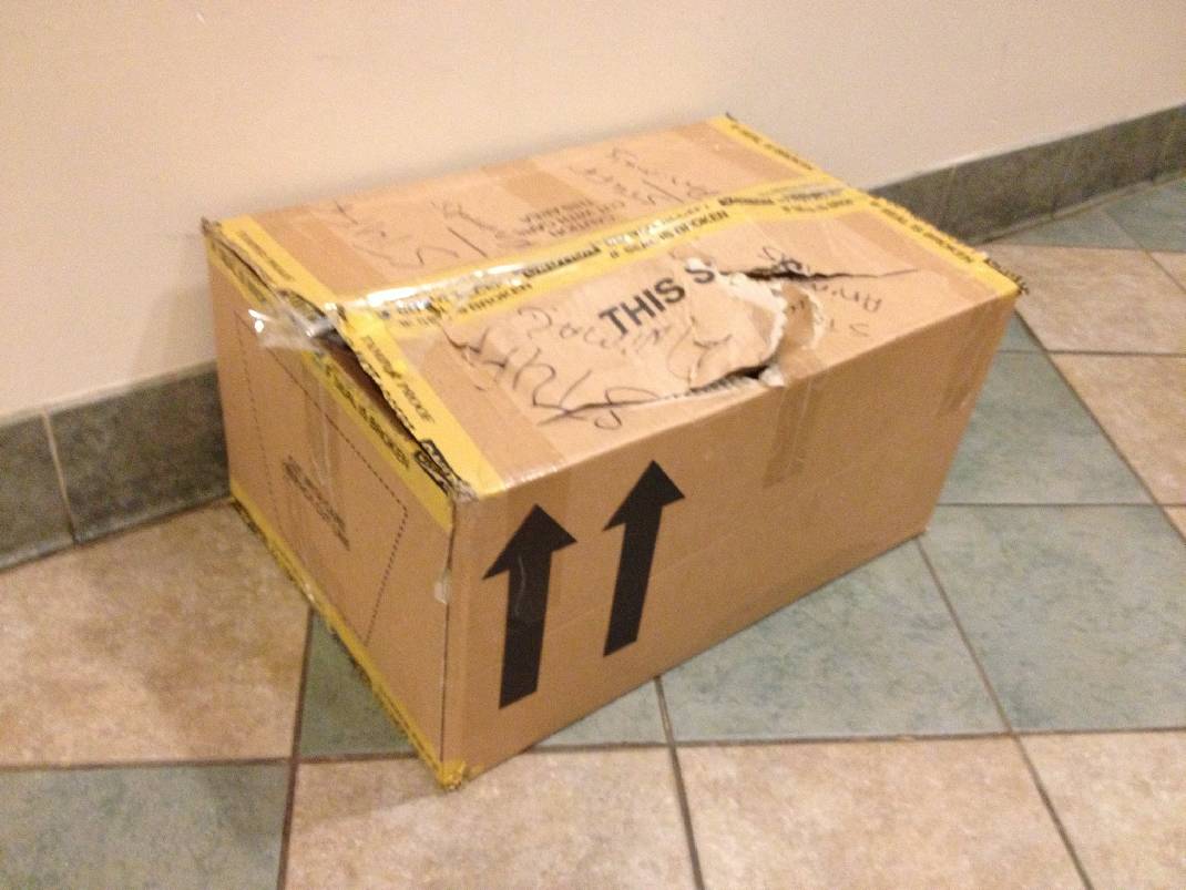 Der Hausmeister fand am Ende der Treppe einen mysteriösen Karton. Er trat draußen, die Treppe hinunter, um die Kiste zu untersuchen. Es war nicht in einem anständigen Zustand. Es war schmutzig mit Löchern an verschiedenen Orten, zerrissen und zusammenklebt. Es gab kein Label darauf, also wusste er nicht, wem es angesprochen wurde.