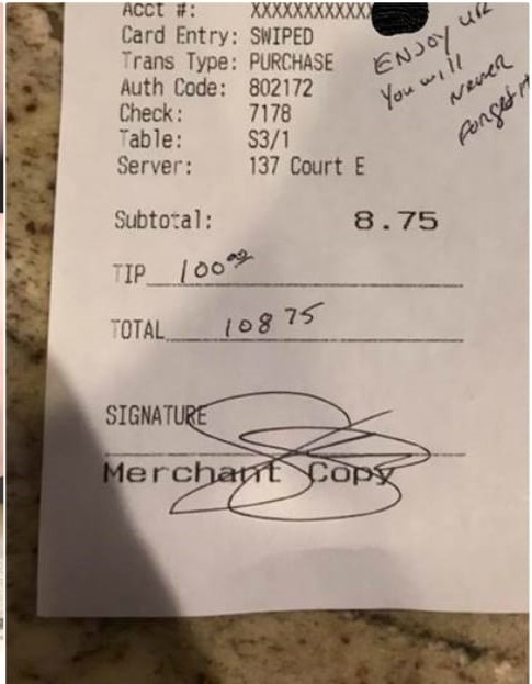 Sobald der Polizist den Scheck bekam, bezahlte er dafür und linke ... oder so schien es. Courtney ging, um den Tisch zu reinigen, als hätte sie immer die Rechnung getan und sammelte die Rechnung, dass der Kunde zurückzahlt und zurücklässt. Aber als sie den Check-Ordner diesmal öffnete, war sie fassungslos.