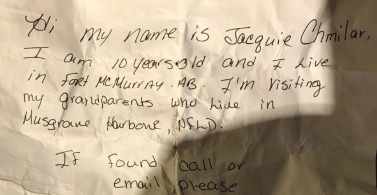 Der Brief aus dem 10-jährigen Lesen: "Hallo, mein Name ist Jacquie Chmilar, ich bin zehn Jahre alt und lebe in Fort McMurray, AB. Ich besuche meine Großeltern, die in Musgrave Harbour, NFLD leben. Wenn Sie anrufen oder per E-Mail gefunden werden. "