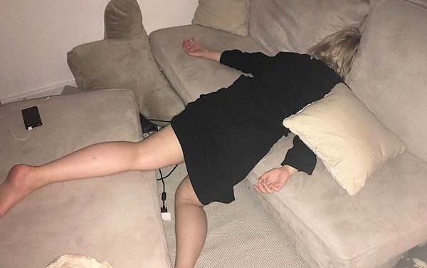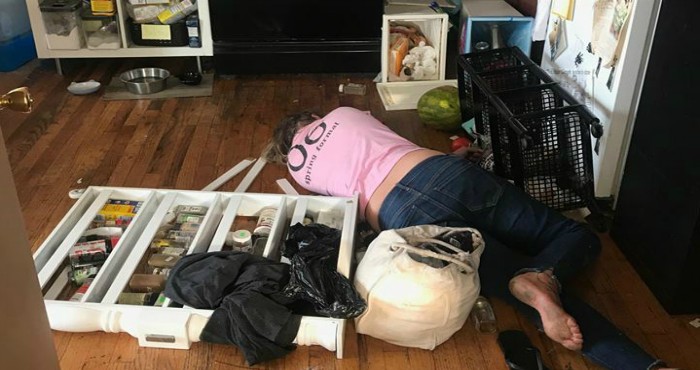 Beim Umklippen der Dame bemerkte Genevieve, dass die Dame ausgegangen war. Genevieve zusammen mit ihrem Mitbewohner entdeckte, dass sie derjenige war, der die gesamte Flasche Wodka getrunken hatte, nach der sie keine Kontrolle über sich selbst hatte, die sich letztendlich auf den Küchenboden hing. Ihr rosafarbenes grafisches T-Shirt, in dem "Getränk, um fröhlich" erwähnt wurde, muss sie dazu ermutigt haben.