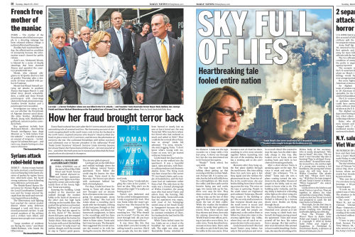In einigen Interviews und Events erzählte sie eine verdrehte Geschichte. Sie sagte, dass sie am Morgen des Angriffs im Südturm war. Sie war im 96. Stock und wartete darauf, dass ein Aufzug nach einem Deal für Merrill Lynch stieß. Während sie auf den Aufzug wartete, hatte die Fluggesellschaft 175 das Gebäude in den unteren Etagen zerschlagen. Sie eilte, um ihr Leben zu retten. Während sie läufte, begann sie ihr Bewusstsein zu verlieren und fiel auf den Boden. Sie erwähnte auch, dass sie von einem mysteriösen sterbenden Mann einen Ring erhielt, der sie bat, den Ring an seine Frau zurückzugeben. Bald starb der Mann und sie ging aus. Ein Mann half ihr, das Bewusstsein zu gewinnen. Auf dem Weg zur Arbeitstreppe brachte ihre Kleider Feuer und der Mann gab ihr ihre Jacke und bat sie, sich zu leiten und sich zu retten, während er zurückkehrte. Sie erwähnte, dass Dave ihr Verlobter war, der sein Leben im Angriff verloren hat.
