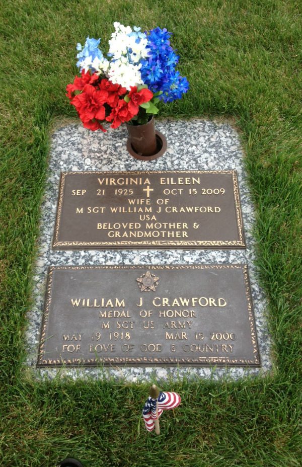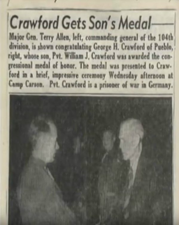 Die US-Regierung hielt Crawfords glaubwürdige Handlungen in hohem Wert auf und erarbeitete ihn posthum mit der Ehrenmedaille, Amerikas höchste militärische Dekoration. Sein Preis wurde von seinem Vater empfangen, als Crawford bereits tot ausgesprochen wurde. Jeder kam in Bezug auf, dass Crawford jetzt ein deutscher Kriegsgefangener war, der jetzt tot gewesen sein muss! Die Preisverleihung war "eine kurze, beeindruckende Zeremonie" und die Medaille wurde von den US-Maj-Gen Terry Allen an Crawfords Pater George übergeben.