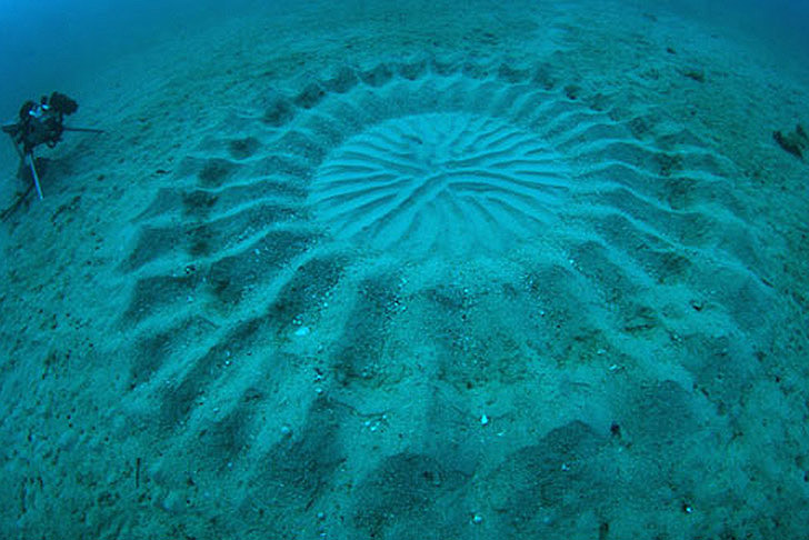 Yoji Ookata ist ein japanischer Fotograf und Taucher. Während 80 Fuß unter dem Meeresspiegel tauchen. Er entdeckte einen geheimnisvollen Kreis, der von dem Pufferfisch im Meer als Paarungsritual gebildet wurde.