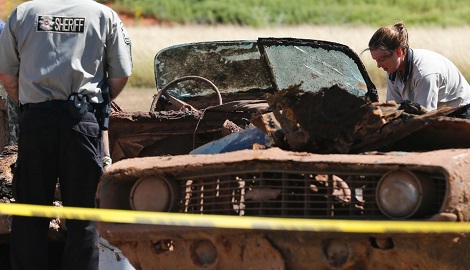 Beim Testen stolperte die neue Sonar in Lake Fließt in Elk City, ein Team von Highway Patrol auf zwei Autos, die für eine lange Zeit in dem See waren. Als sie nach innen sahen, fanden sie drei Skelette in jedem Auto. Ein DNA-Test wurde durchgeführt, die bestätigt, dass das Skelett Beschreibung entspricht 6 Jugendliche, die jeweils in den Jahren 1969 und 1970 vermissen.