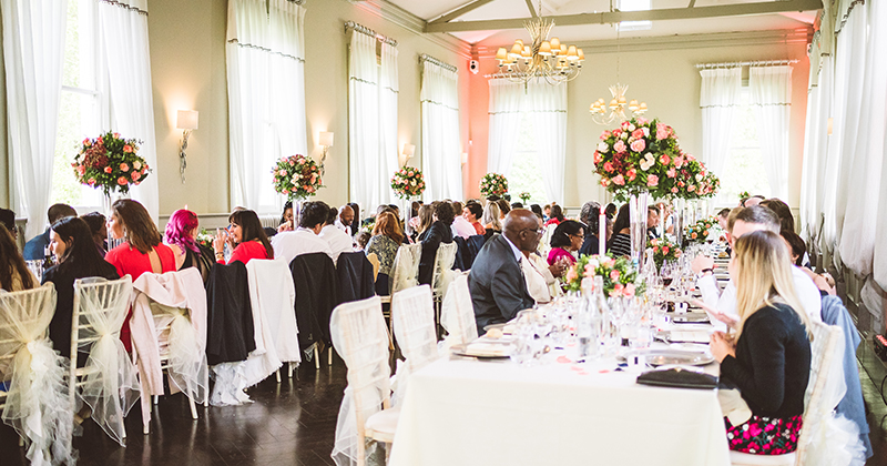 Während die Gäste auf den Vorspeisen kamen, spielte das Orchester die Melodie von "Mein Herz wird weitergehen." Aus dem FilmTitanic.. Das Rampenlicht fokussierte sich auf die Eingangstür, und einige Leute mit rosafarbenen Blütenblättern standen in der Nähe des Tors, als wären sie strikt befohlen, das Paar auf die Bühne zu begleiten.