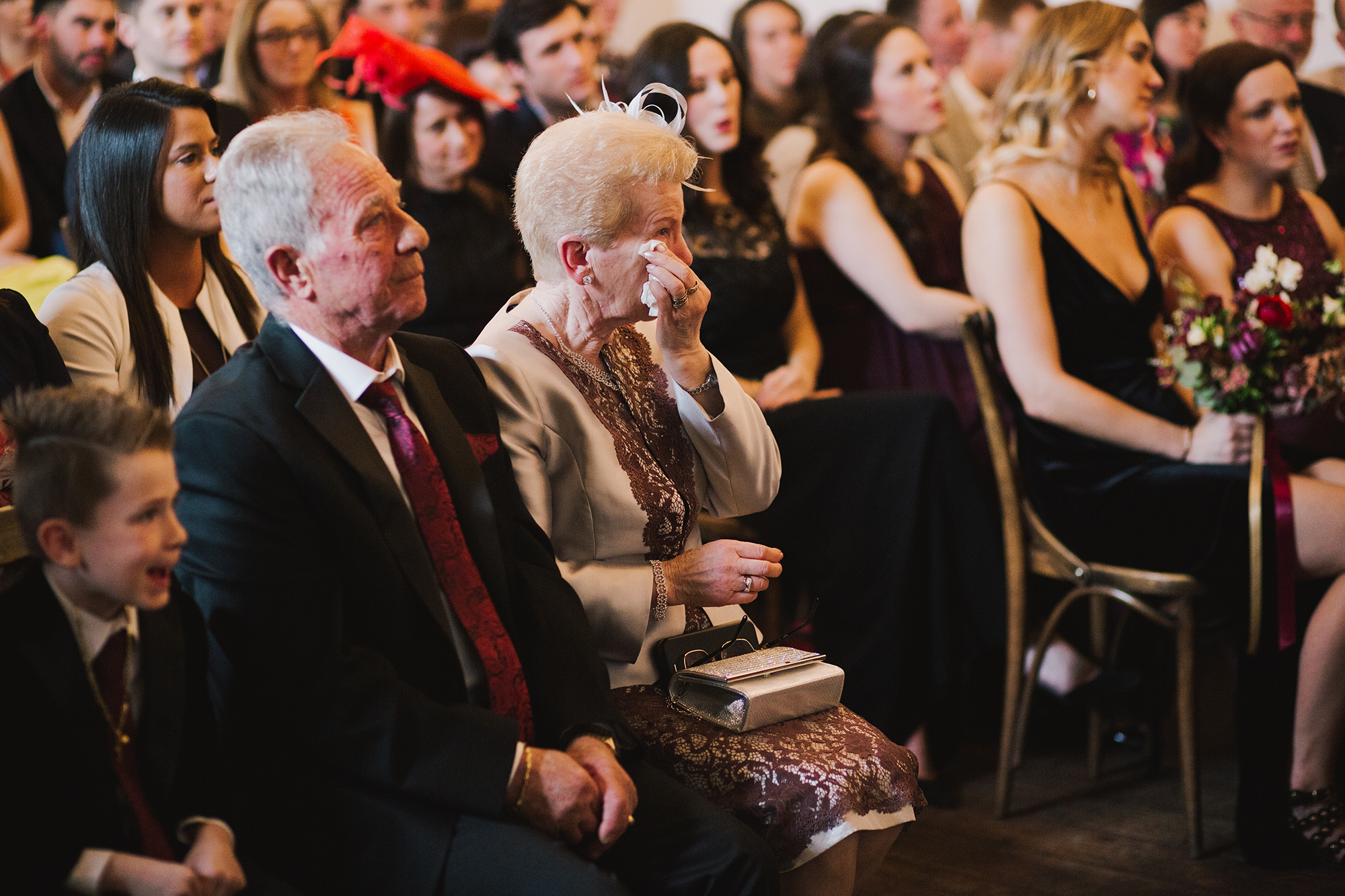 Endlich war das Warten vorbei. Das Paar kam in den Hall hielt die Hände und lächelte aneinander. Der Bräutigam sah ein wenig verloren, während die Braut nach jemandem suchte. Sie muss nach ihrer Mutter suchen, da sie ein großer Tag für sie war.