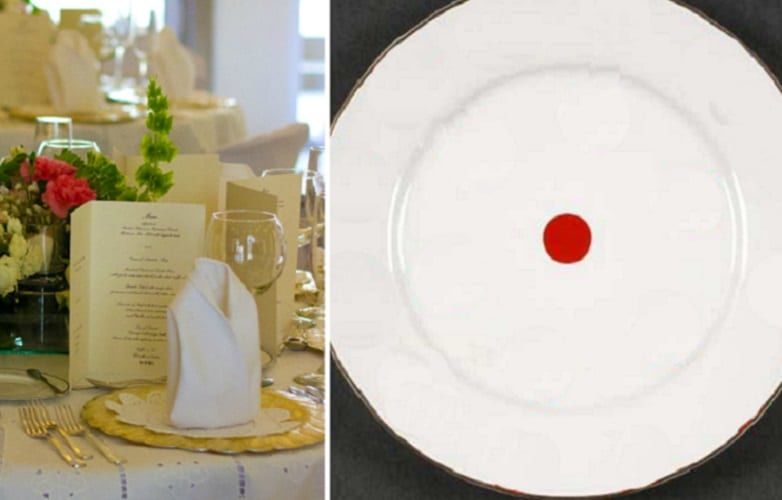 Da alle die Teller umkehrten, erlangte ein Mann, der ein bisschen unbequem ging, die Gäste auf sich aufmerksam gemacht. Er war der einzige, der einen roten Punkt auf der Rückseite seines Tellers hatte. Der Bräutigam fragte ihn, um weiter zu stehen, und andere entspannten sich, mit den Augen, mit denen ihre Augen am Mann fixierten.