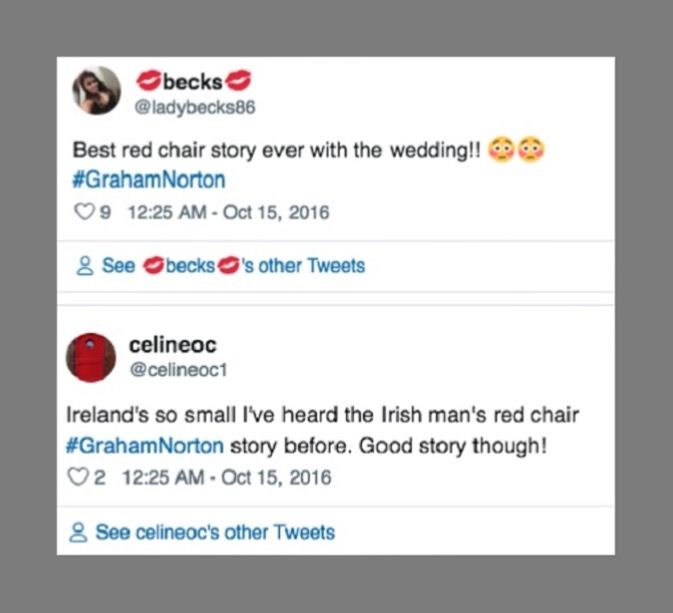 Sean's Geschichte war die beste große rote Stuhlgeschichte aller Zeiten. Es war klar von Graham Nortons Reaktion, dass selbst er von Seans gebrochener Hochzeit zurückgenommen wurde. Norton brüllte in Sean's Geschichte in einen Gelächter und applaudierte ihn für seine Bemühungen.