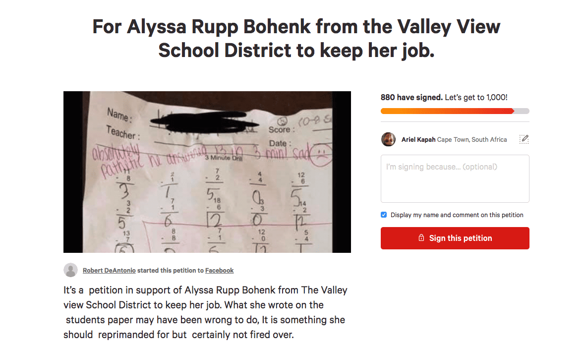 Eine neue Petition wurde dieses Mal eingereicht, diesmal für Alyssa, um ihren Job zu halten. Diese Petition wurde nicht von Tausenden von Menschen unterzeichnet, aber es hat die notwendige Aufmerksamkeit von den Menschen in der Gemeinschaft erwischt. Die Menschen in den Gunsten argumentieren immer, dass der Lehrer gewarnt werden sollte, aber nicht abgefeuert werden sollte.