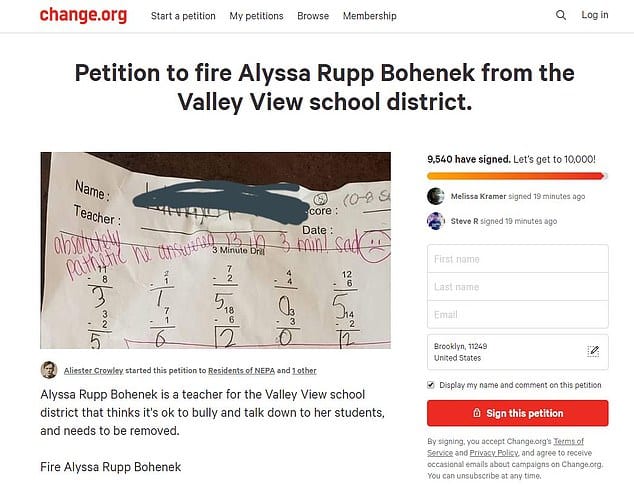 Es war ein paar Tage, seit der Petition online ging, und bis zu diesem Zeitpunkt hatten es bereits mehr als zehntausend Menschen angemeldet. Infolgedessen entschieden sich eine Gruppe von Lehrern, auf Alyssa auf Alyssa zu sprechen und zu reagieren. Sie stimmten zu, was sie für den jungen Jungen verletzend gewesen sei, und sie sollte dafür getrübt werden, aber sie hat es nicht verdient, ihren Job zu verlieren.
