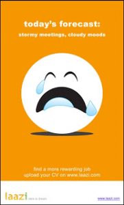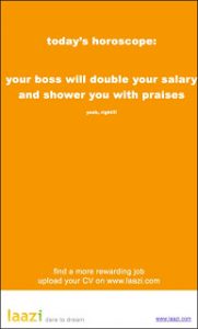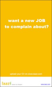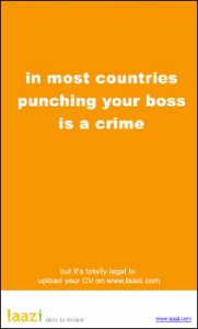 Eine Firma namens Laazi erhielt Hunderte von Antworten auf diese auffälligen Jobanzeigen. Die in mühsame Buchstaben angegebene Anzeige "in den meisten Ländern ist der Boss ein Verbrechen ein Verbrechen", gefolgt von in kleinerem Text unten, ", aber es ist völlig legal, Ihren Lebenslauf auf www.laazi.com hochzuladen" auf www.laazi.com "Die Kampagne erstellt mehrere andere Anzeigen mit Ähnliche One-Liner, "Willst du einen neuen Job, über den sich beschweren?" und "Heutige Prognose: stürmische Meetings, bewölkte Stimmungen".